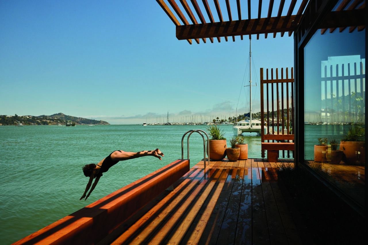 After stepping away from careers in marketing and technology, cofounders Alex Yenni and Gabe Turner set out to help people experience California’s landscape not just as a backdrop, but also as something to be felt. “We were deeply inspired by what we’d seen in Copenhagen and Oslo, both of which have amazing thermal contrast sauna and plunge sites, often located right on the water,” Yenni says. “Given the temperate, cool year-round climate and the presence of this big, beautiful body of water, it felt like a missed opportunity that nothing similar existed in the San Francisco Bay Area.” Their idea came to life in collaboration with architect Nick Polansky, who drew from the area’s industrial shipbuilding history. The structure repurposes Corten steel shipping containers and is wrapped in local redwood. “We wanted to blend some minimalist California design elements with more of an industrial look and feel,” Yenni says.