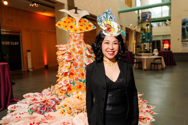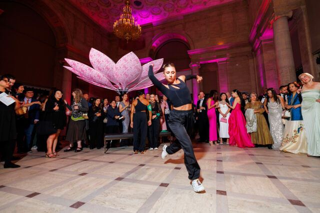 Decked out in black-tie or cultural attire, guests commenced with cocktails in Bogart Court, where they were equally wowed by McCalls Catering and Events bountiful dim sum and sushi buffets, as well as IRL interactive artist presentations. Couturière Colleen Quen invited revelers to write blessing messages on hand-painted petals of one of her show-stopping gowns, while Mia Cunnan, Miss Asian California 2025, modeled Quen’s accompanying petal flower chapeau.