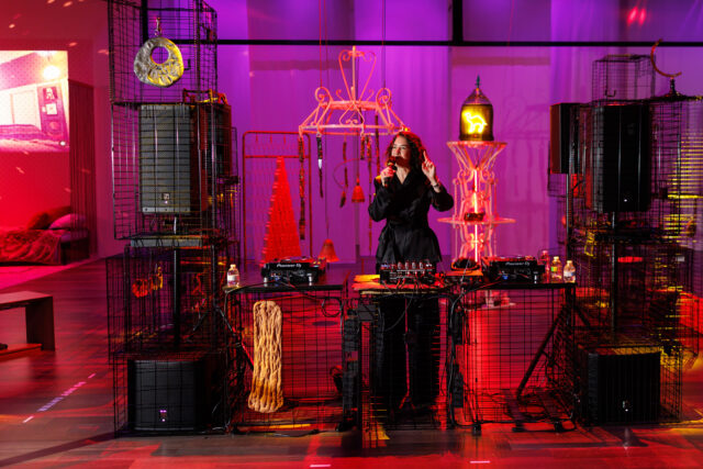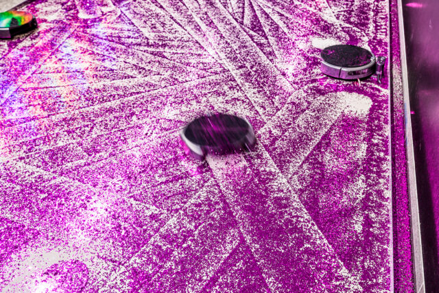 As reprogrammed Roombas swirled patterns of fuchsia glitter along a floor of the Asian Art Museum, it was clear a new dawn has broken at this vaunted cultural institution in the heart of San Francisco’s Civic Center. Created by Yasemin Baydar and Birol Demir, the artist duo known as :mentalKLINIK, their sparkly Puff Out installation delighted 1,100 guests on Wednesday, October 22, at the museum’s annual gala and opening of its Rave into the Future: Art in Motion, a dynamic, club-inspired exhibition (curated by Naz Cuguoğlu) highlighting works by women and queer artists of the West Asian diaspora.