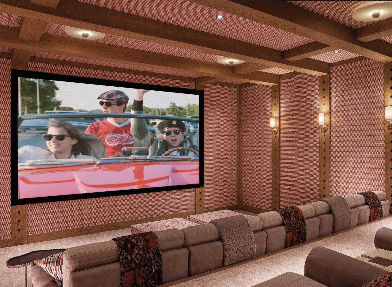 That grounded Gaucho feel pervades throughout. An expansive salmon-pink cinema room, with seats designed by theater interiors company Cineak, was conceived with the Navajo aesthetic in mind. Elsewhere in the house, the cozy family room, used for cuddling and watching TV, was fashioned into a little garden room. Hand-painted wallpaper by Fromental features ferns and Japanese aralia and wisteria, and then the eye is drawn upward to a dramatic chandelier of metal leaves by former jewelry designers Delos & Ubiedo. It’s almost as though the plants are growing inside the room, in both two- and three-dimensional forms.