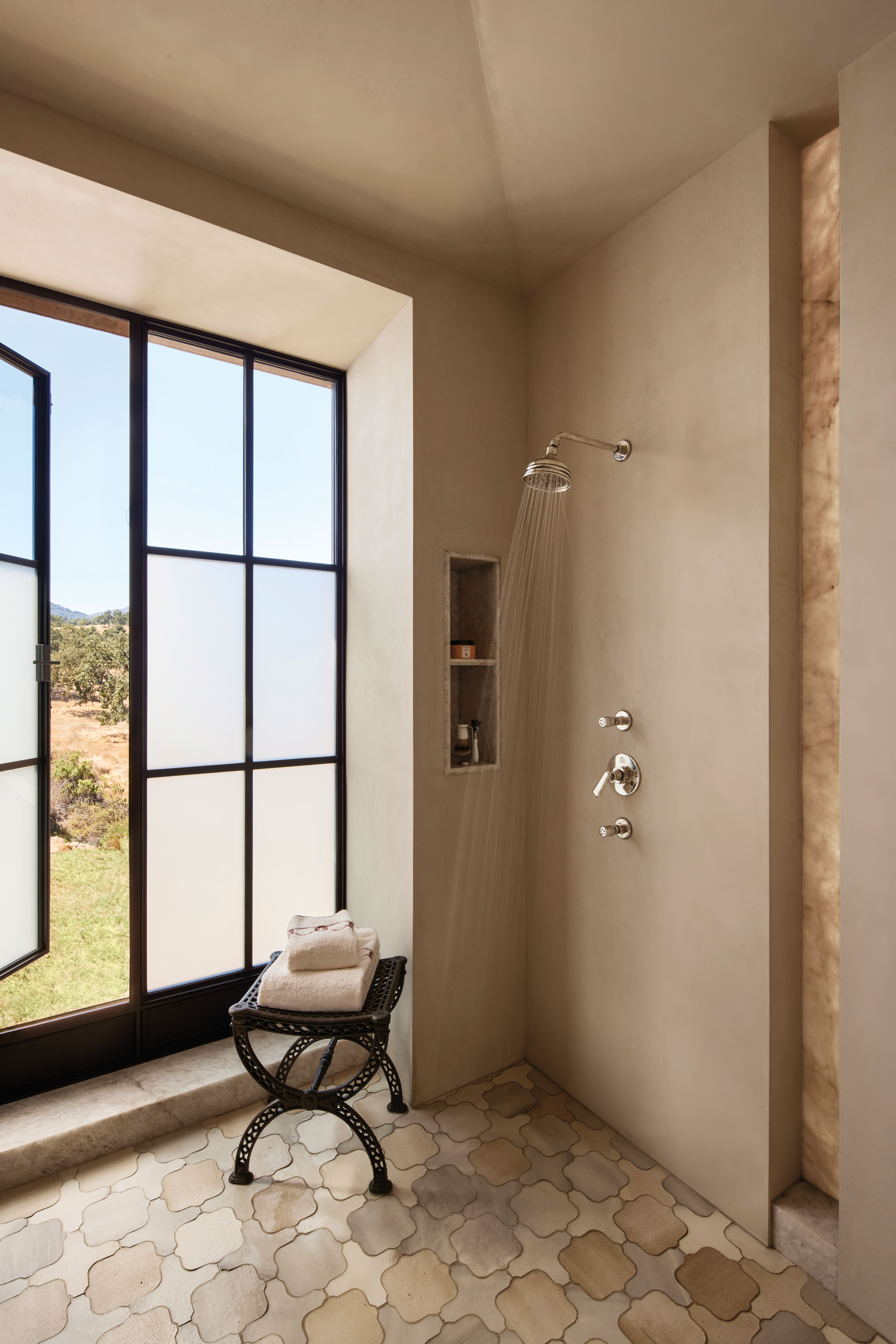 Beard crafted a site plan built around three courtyards: an arrival courtyard, a central spot, and a lateral one. Together the two teams decided on materials that would be Tundra Cream limestone, tile, and wood. Jeffers owned the color choices and furnishings that would embody what he calls “New Rustic.”