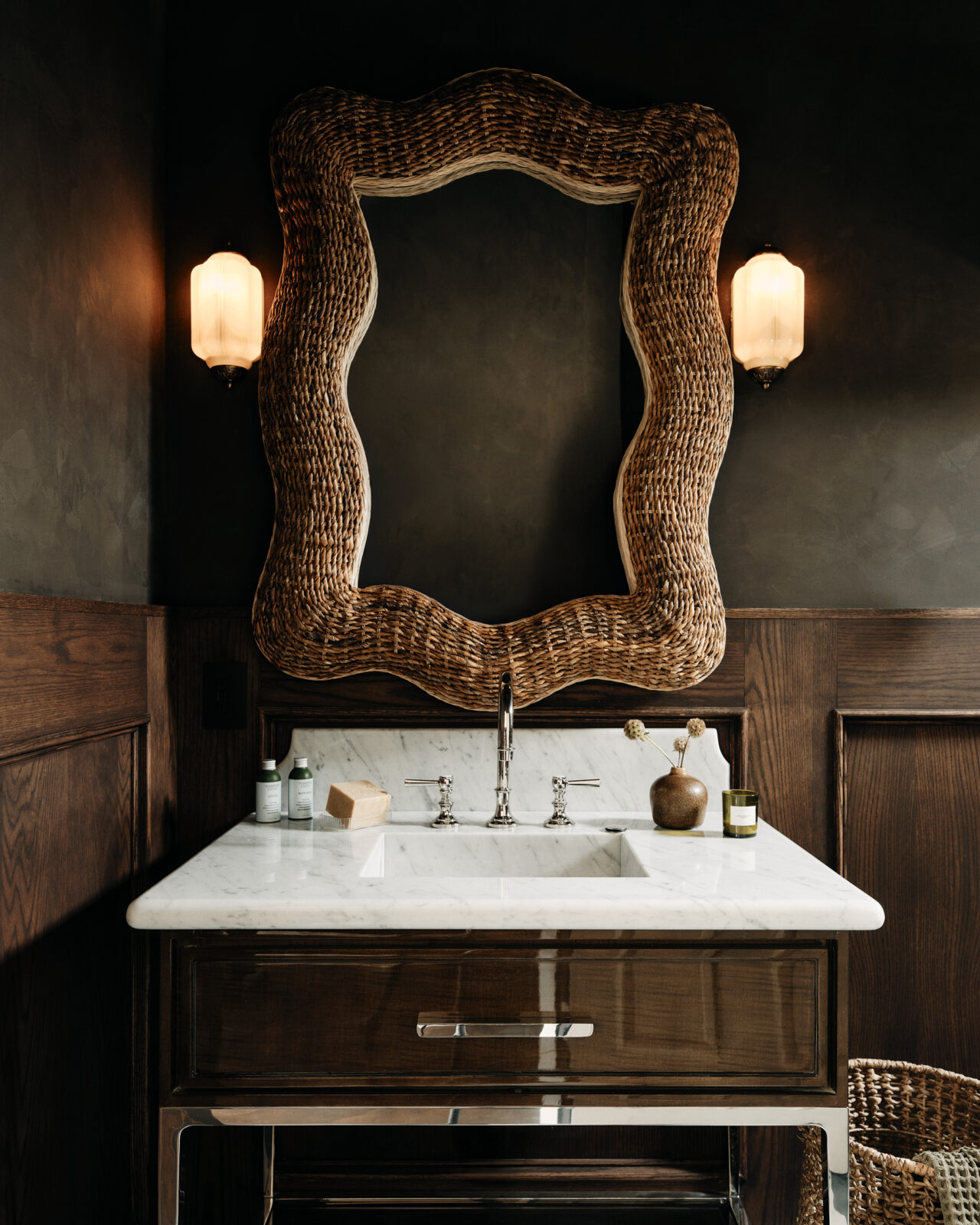 The moodiness of this first-floor powder room has been achieved through dark Roman clay walls, custom patterned Zia marble tile flooring, bespoke wood paneling, vintage lighting, an RH vanity, and an oversize Lulu and Georgia mirror.