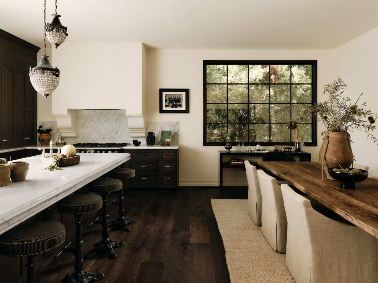 Separated only by a custom-designed Carrara marble island, the dining room is a natural extension of the kitchen with ample natural light thanks, in part, to a large window framing the side garden.