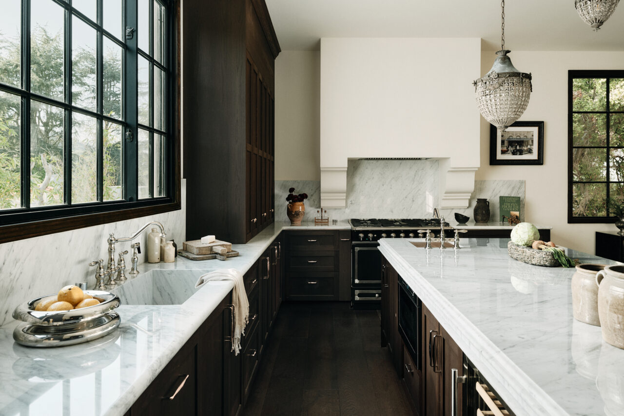 “We really wanted the room to feel like a long, full primary suite, so we moved the tub — raised it onto a deck with the arch sort of enveloping it as a focal point,” Leigh says. Small elements like the polished nickel hardware from Waterworks make a big difference in the overall space marked by custom wood cabinetry and Carrara marble.