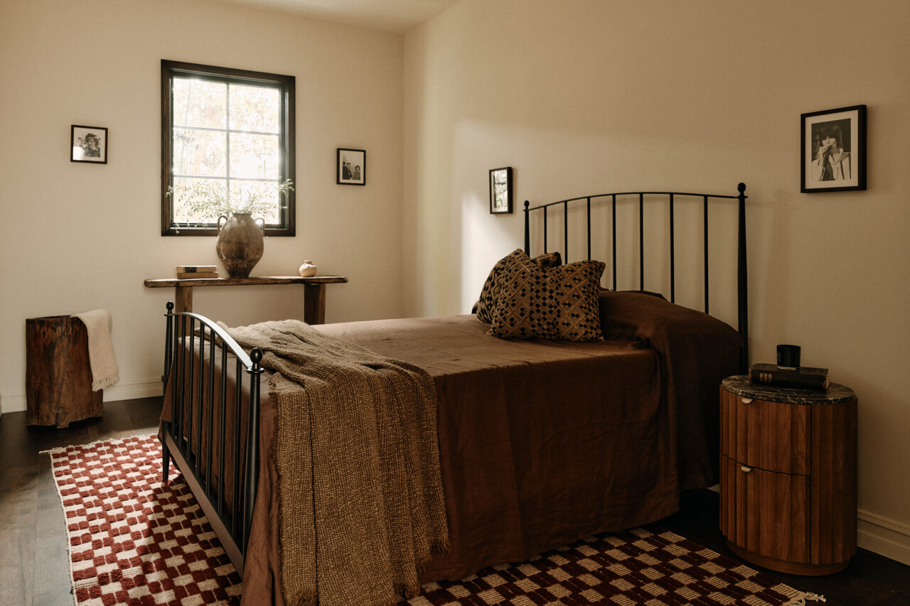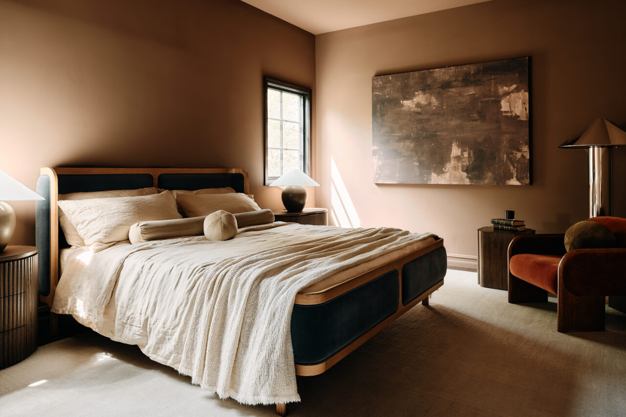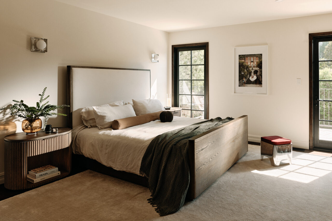 For the primary bedroom, the designers created a second door for symmetry and to allow for more natural light with access to the terrace. “Marvin does this really cool thing where they’ll design a window that is a door system, so it’s actually a fixed door and the grid lines and everything match,” Hahn says. Adding to the ambiance, custom cabinetry and a paneled wall reflect the design firm’s thoughtful and holistic approach to detail.