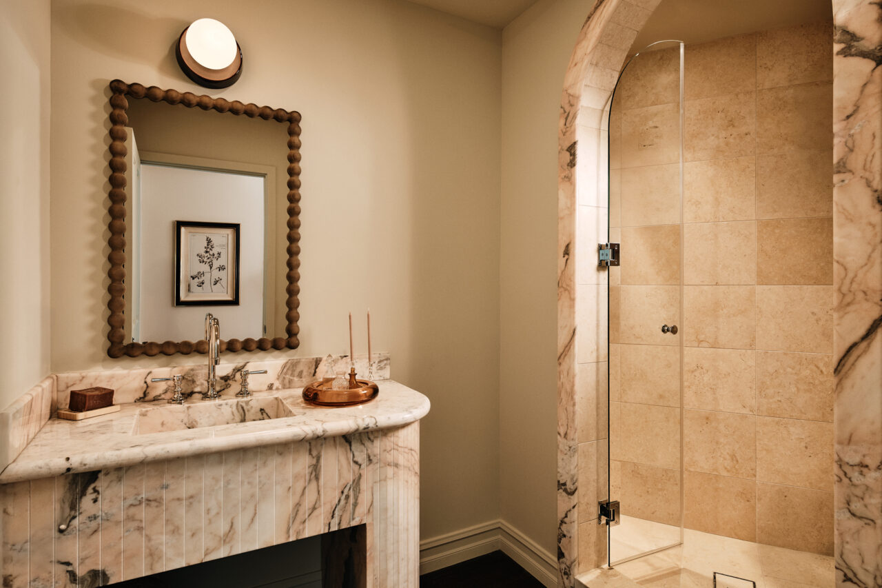 “That pink stone — I’m obsessed with it,” Leigh says. “We actually searched for so long to find that stone. The main guest bathroom offers the warmth of a spa with an updated art deco feel.