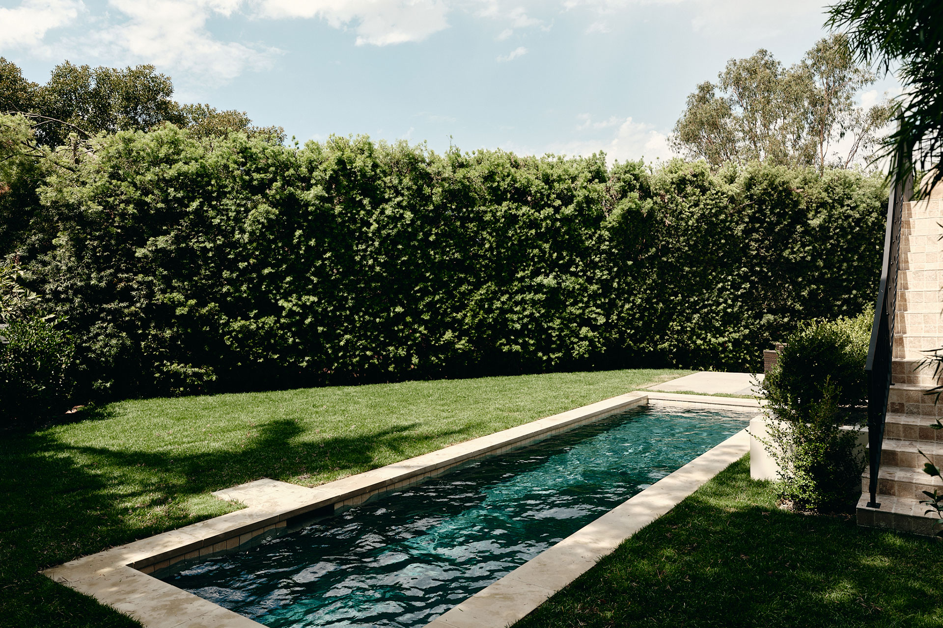 “We ended up putting in more of a lap pool so that you had as much yard space as possible,” Hahn says. A firepit and an outdoor kitchen are a natural extension of the pool area ideal for entertaining all year long.