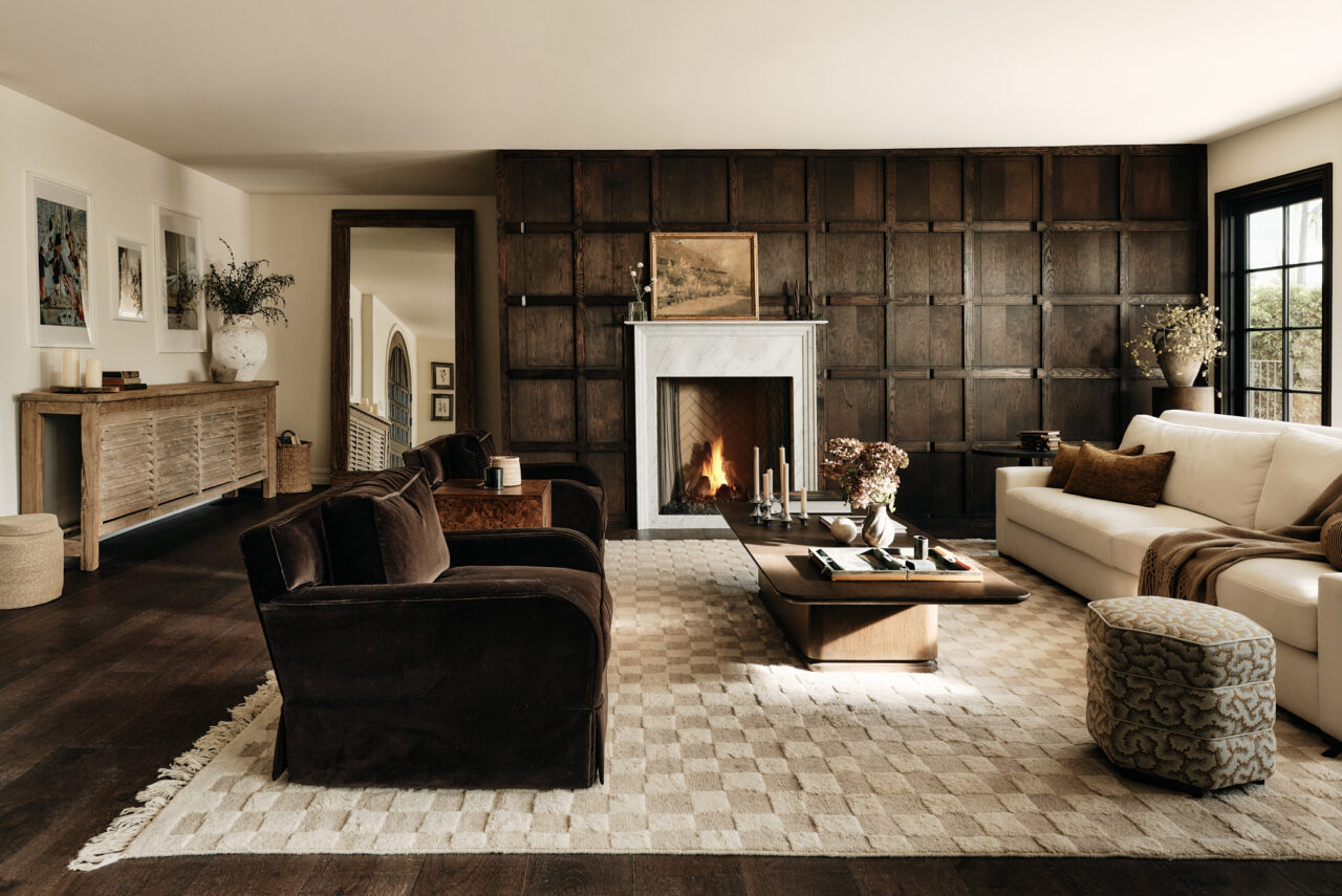 It was important to preserve the home’s architectural character, which included the fireplace as a focal point. “We love a paneled wall,” the duo agrees. Leigh adds, “The fireplace was off-center to the room and we had to figure out a way to still have ample built-ins and space without making it look off-center, because the fireplace needed to feel central.” They used the custom oak paneling as a tool to incorporate hidden cabinetry and reach their aesthetic goal.