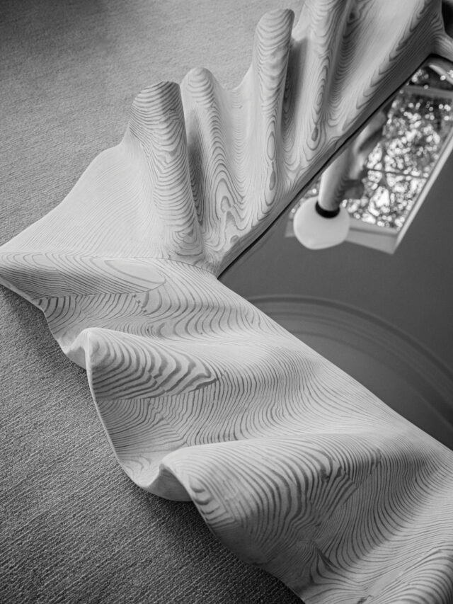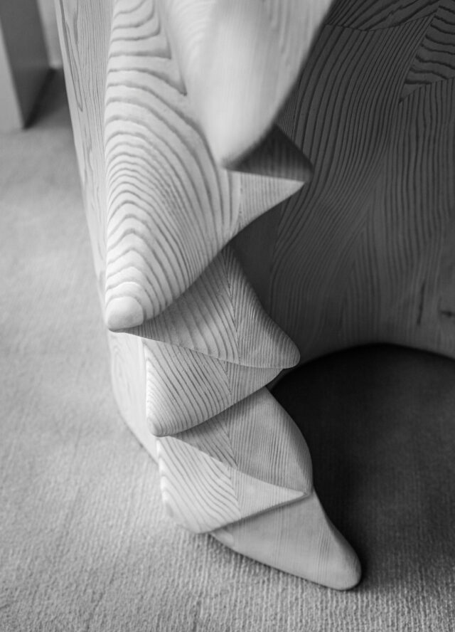 SK: Once we decided on sketches, I created the whole collection out of fabric. Then I made bases at the wood shop and draped everything in fabric to get a more to-scale 3D model. I don’t know how to 3D model on the computer, but I know how to drape fabric on a dress form. So I created my own furniture forms and 3D scanned all the fabric drapes so it’s not total freehand carving. Creating with fabric first is important to me — that it’s not just modeled on a computer.