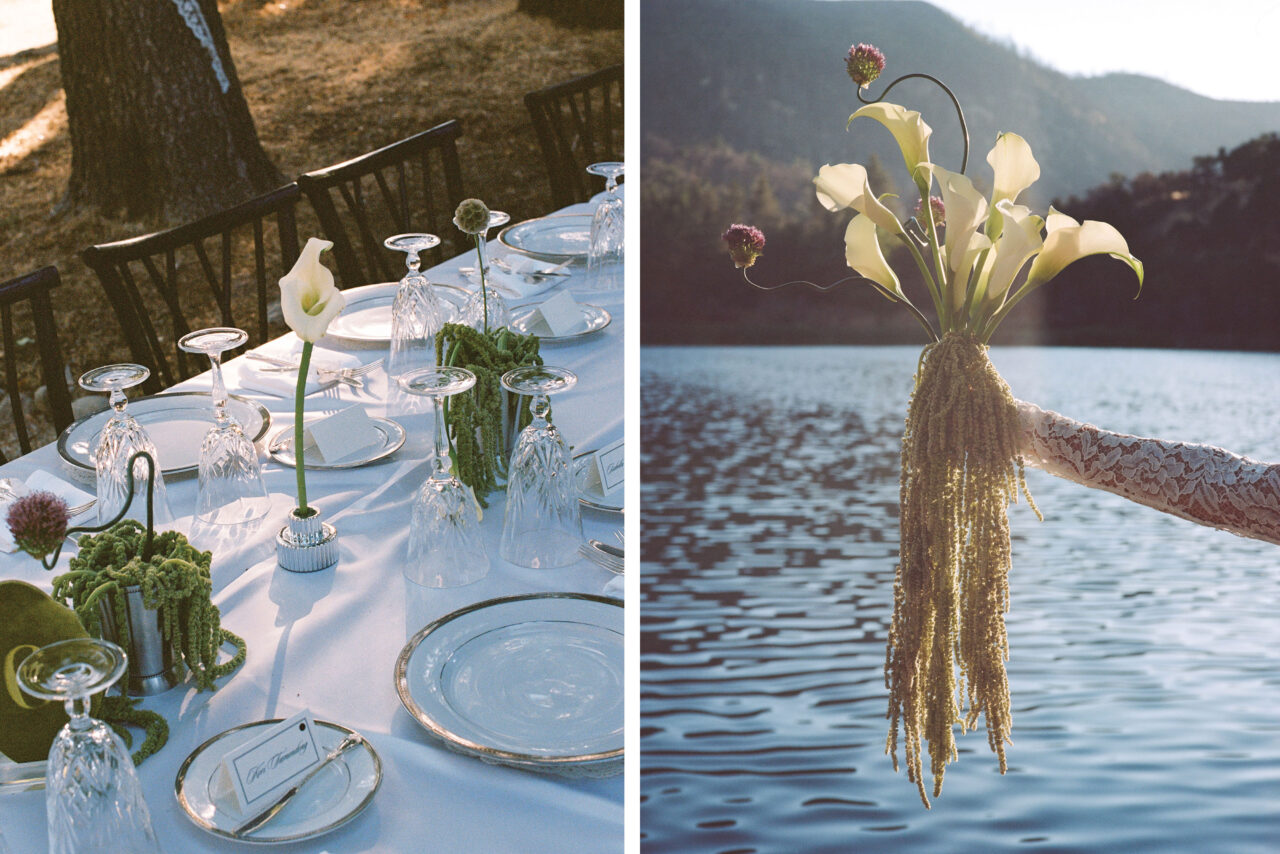 On a balmy afternoon last July, 120 guests joined lakeside to witness Erin and Chris exchange their vows with the hazy San Rafael mountains looming in the backround. After the ceremony, the festivities remained outdoors with friends and family gathering beneath a dense canopy of redwoods for a sit-down dinner of grilled halibut, robust salads, and grilled vegetables lit in the romantic glow of candles among verdant floral arrangements. The cutting of the cake then led to dancing, late night canoeing, cannonballs, and bonfire karaoke. The affair continued for two more days with everyone staying at the lake together. “To see all of your loved ones from different chapters of your life having a blast, taking selfies, drinking delicious wine, all transported to this oasis in the middle of nowhere,” Erin says. “It’s an unexplainable feeling.”